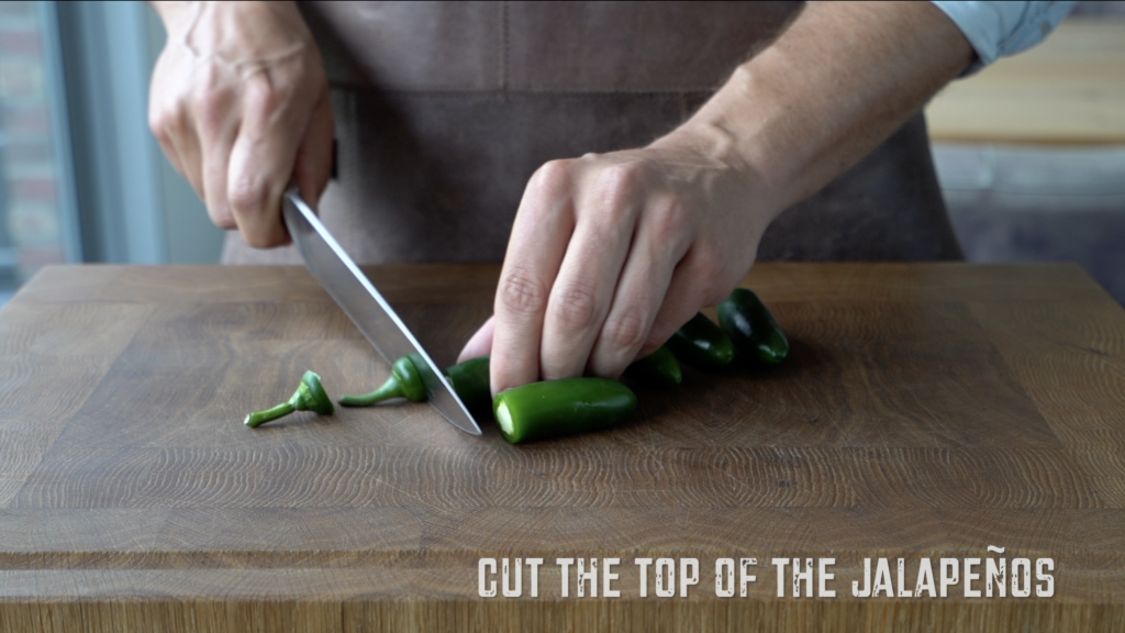 Neem 10 gram koriander en pluk de blaadjes van de steeltjes. Snijdt daarna zo fijn mogelijk. Rasp daarna 50 gram cheddar kaas (of koop al geraspt). Voeg dit bij 50 gram roomkaas en meng het geheel goed door elkaar. Hol de jalapenos uit en vul daarna met het mengsel. Stop ze zo vol mogelijk.